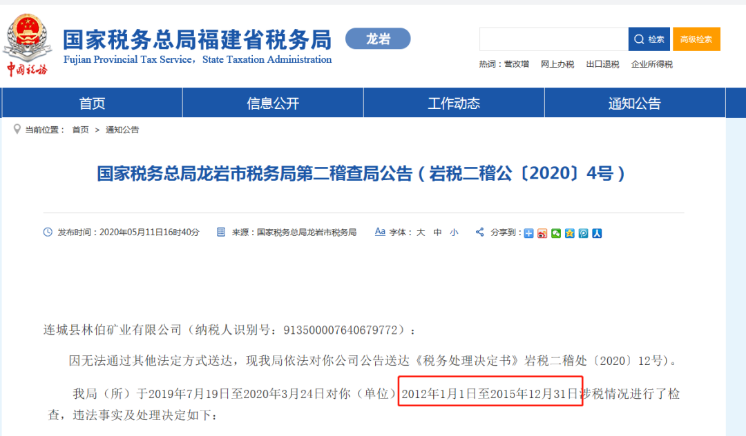 连城县林伯矿业有限公司(纳税人识别号:913500007640679772):