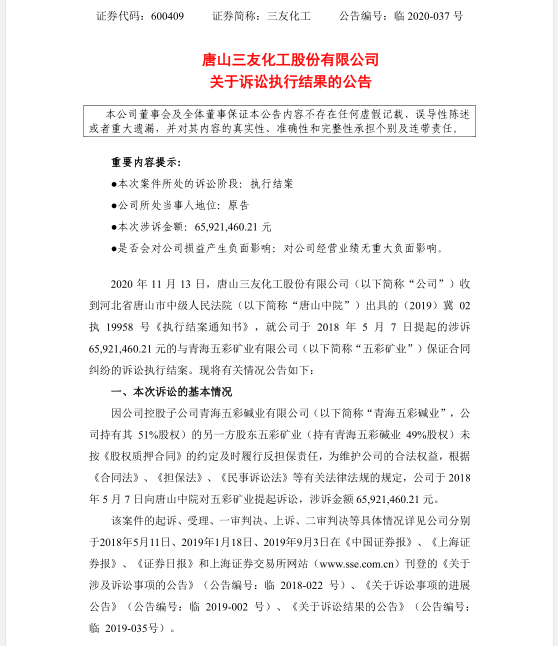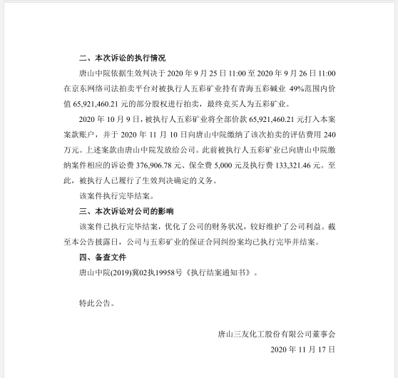 ●是否会对公司损益产生负面影响:对公司经营业绩无重大负面影响。 2020年11月13日,唐山三友化工股份有限公司(以下简称“公司”)收到河北省唐山市中级人民法院(以下简称“唐山中院”)出具的(2019)冀02执19958号《执行结案通知书》,就公司于2018年5月7日提起的涉诉65,921,460.21元的与青海五彩矿业有限公司(以下简称“五彩矿业”)保证合同纠纷的诉讼执行结案。现将有关情况公告如下: 因公司控股子公司青海五彩碱业有限公司(以下简称“青海五彩碱业”,公司持有其51%股权)的另一方股东五彩矿业(持有青海五彩碱业49%股权)未按《股权质押合同》的约定及时履行反担保责任,为维护公司的合法权益,根据《合同法》、《担保法》、《民事诉讼法》等有关法律法规的规定,公司于2018年5月7日向唐山中院对五彩矿业提起诉讼,涉诉金额65,921,460.21元。 该案件的起诉、受理、一审判决、上诉、二审判决等具体情况详见公司分别于2018年5月11日、2019年1月18日、2019年9月3日在《中国证券报》、《上海证券报》、《证券日报》和上海证券交易所网站(www.sse.com.cn)刊登的《关于涉及诉讼事项的公告》( 公告编号:临 2018-022 号)、《关于诉讼事项的进展公告》( 公告编号:临 2019-002 号)、《关于诉讼结果的公告》( 公告编号:临 2019-035号)。 唐山中院依据生效判决于2020年9月25日11:00至2020年9月26日11:00在京东网络司法拍卖平台对被执行人五彩矿业持有青海五彩碱业49%范围内价值65,921,460.21元的部分股权进行拍卖,**终竞买人为五彩矿业。 2020年10月9日,被执行人五彩矿业将全部价款65,921,460.21元打入本案案款账户,并于2020年11月10日向唐山中院缴纳了该次拍卖的评估费用240万元。上述案款由唐山中院发放给公司。此前被执行人五彩矿业已向唐山中院缴纳案件相应的诉讼费376,906.78元、保全费5,000元及执行费133,321.46元。至此,被执行人已履行了生效判决确定的义务。 该案件已执行完毕结案,优化了公司的财务状况,较好维护了公司利益。截至本公告披露日,公司与五彩矿业的保证合同纠纷案均已执行完毕并结案。 唐山中院(2019)冀02执19958号《执行结案通知书》。 据了解,唐山三友化工股份有限公司是全国纯碱(即碳酸钠)行业的排头兵、首套大型纯碱装置国产化样板企业,资产总额57.4亿元,年实现销售收入50亿元。几年来,在董事长、党委书记的带领下,实现了快速发展、科学发展,纯碱产量已由设计时的60万吨提高到200万吨,产量、质量、成本、市场占有率、出口创汇五项指标连续多年位居行业**,是国内同行业**一家通过ISO9002质量体系和产品质量双认证的企业。2003年,三友化工A股股票在沪市挂牌上市。 青海五彩矿业有限公司成立于2007年09月17日,注册地位于海西州大柴旦饮马峡工业园区内,法定代表人为冯茂生。经营范围包括工业纯碱的生产、销售及矿产品(包括盐化工附属产品)的开发、加工、销售;聚苯乙烯塑料管、塑料编织袋的生产、销售;经营国家禁止的和制定企业经营以外的进出口商品;经营进出口代理业务(以上项目涉及行政许可的凭许可证经营)原盐生产销售、销售及运输;煤炭、焦炭的运输及贸易;机械设备、电子产品、塑料制品、金属材料、建筑材料、润滑油的贸易。(以上项目涉及行政许可的凭许可证经营)。唐山三友化工股份有限公司关于诉讼执行结果的公告