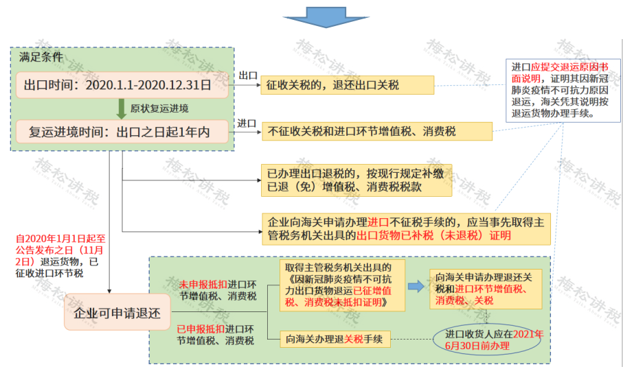 1、对自2020年1月1日起至2020年12月31日申报出口,因新冠肺炎疫情不可抗力原因,自出口之日起1年内原状复运进境的货物,不征收进口关税和进口环节增值税、消费税,出口时已征收出口关税的,退还出口关税。