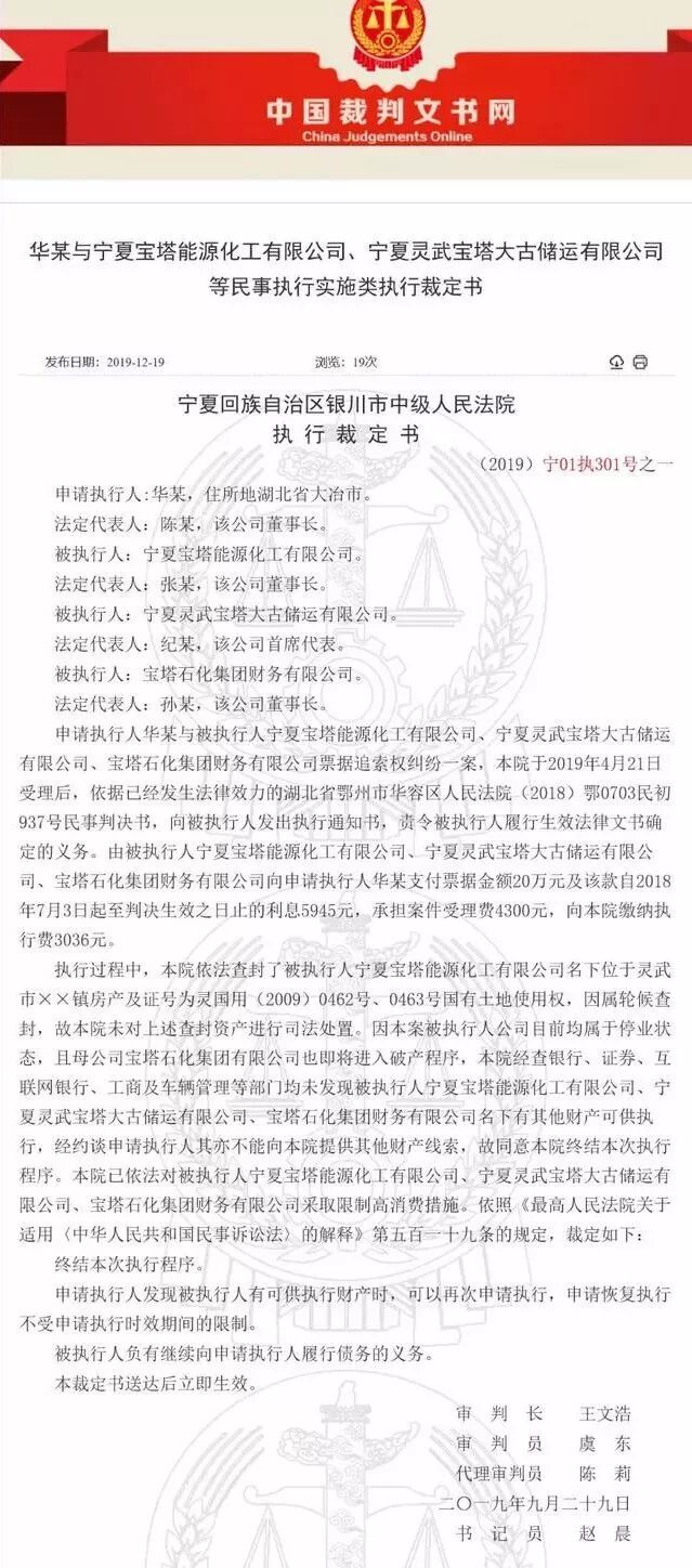 2019年12月20日,记者自裁判文书网获悉,宁夏回族自治区银川市中级人民法院于今年9月作出了(2019)宁01执301号之一执行裁定,该文书显示,宝塔石化集团有限公司即将进入破产程序,宝塔石化集团财务有限公司等名下已无其他财产可供执行。(2019)宁01执301号之一系申请执行人华某与被执行人宁夏宝塔能源化工有限公司、宁夏灵武宝塔大古储运有限公司、宝塔石化集团财务有限公司票据追索权纠纷一案。法院表示,其于今年4月受理后,依据已经发生法律效力的湖北省鄂州市华容区人民法院(2018)鄂0703民初937号民事判决书,向被执行人发出执行通知书,责令被执行人履行生效法律文书确定的义务。由被执行人宁夏宝塔能源化工有限公司、宁夏灵武宝塔大古储运有限公司、宝塔石化集团财务有限公司向申请执行人华某支付票据金额20万元及该款自2018年7月3日起至判决生效之日止的利息5945元,承担案件受理费4300元,向法院缴纳执行费3036元。 宁夏回族自治区银川市中级人民法院表示,执行过程中,法院依法查封了被执行人宁夏宝塔能源化工有限公司名下位于灵武市××镇房产及证号为灵国用(2009)0462号、0463号国有土地使用权,因属轮候查封,故法院未对上述查封资产进行司法处置。因本案被执行人公司目前均属于停业状态,且母公司宝塔石化集团有限公司也即将进入破产程序,法院经查银行、证券、互联网银行、工商及车辆管理等部门均未发现被执行人宁夏宝塔能源化工有限公司、宁夏灵武宝塔大古储运有限公司、宝塔石化集团财务有限公司名下有其他财产可供执行,经约谈申请执行人其亦不能向法院提供其他财产线索,故同意法院终结本次执行程序。 公开资料显示,宝塔石化集团是以石油化工为主,产学研结合,产融结合,科技创新和石油化工装备制造为一体的大型企业集团。2016年企业总资产685亿元,职工1.5万人。在2018年中国500强企业排行榜上,宝塔集团以524.78亿元的营业收入位列第306位、中国制造业企业500强第138位。 2018年11月初,宝塔实际控制人孙珩超在一次讲话中表示,受国际经济环境深刻变化、国内经济转型和结构调整等大环境影响,民营企业的发展遇到了诸多困难,宝塔也不能独善其身,同时企业管理能力与快速发展不相匹配,一些隐藏的问题逐渐显现并成为制约企业发展的一大因素。国际、国内、自身三重因素的叠加,使宝塔当前的发展面临严峻考验。2018年11月,宝塔石化集团旗下上市公司宝塔实业公告称,11月16日在宁夏宝塔石化大厦4楼多功能厅召开的集团**别领导会议上,公安机关通报公司实际控制人孙珩超涉嫌刑事犯罪。这标志着宝塔集团的票据问题走向公开化。2018年12月,银川警方发布消息称,已立案侦查宝塔石化集团涉嫌票据诈骗一案。此外,银川检察院12月18日决定对孙珩超等8名涉案犯罪嫌疑人批准逮捕,其中,宝塔石化集团董事长孙珩超涉嫌票据诈骗罪。银川警方在2018年12月19日对上述人员执行逮捕。目前,案件正在进一步侦办中。根据宝塔石化集团在中国货币网披露的2018年前三季度报表,公司负债达340.56亿元,其中应付票据164亿元。此为宝塔石化集团近来**后一次披露财报,其后的2018年年报及2019年各季报均未按期披露。宝塔石化集团在公告中表示,因公司实际控制人孙珩超涉嫌刑事犯罪被公安机关立案侦查,公司面临重大不确定事项。目前,宝塔石化集团的两只债券“14宁宝塔MTN001”、“14宁宝塔MTN002”均因未能按期足额兑付**,已构成实质性违约。11月29日,宝塔石化集团就违约后续进展发布公告称,公司后续将继续在政府工作组指导下开展各项工作,保持与主承销商、各投资者及相关部门的密切沟通。